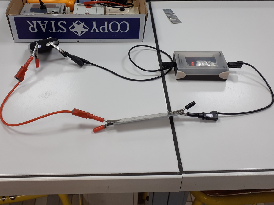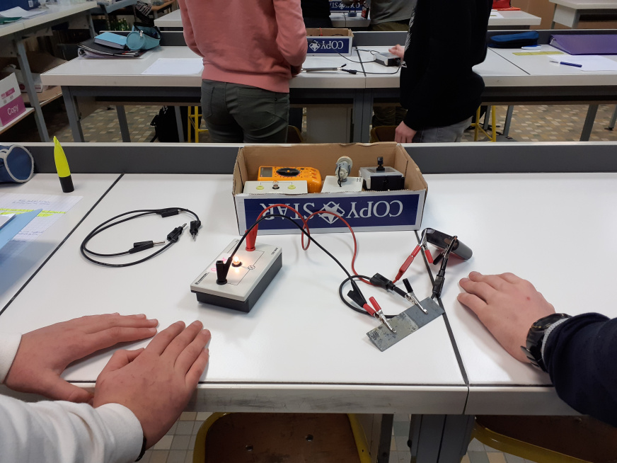 Circuit electrique avec un moteur un amperemetre et un interrupteur permettant de tester la conductibilites des solides 3e