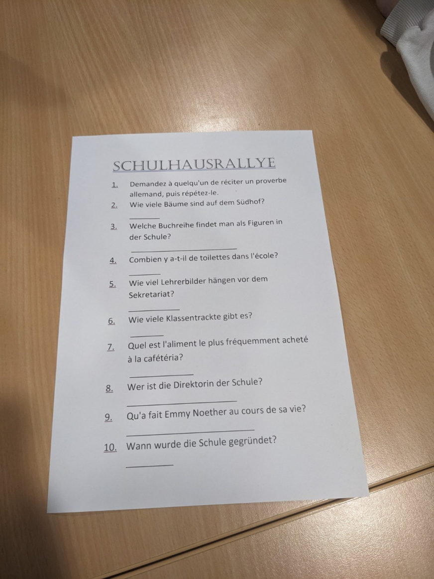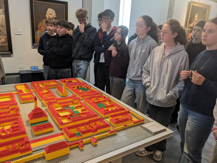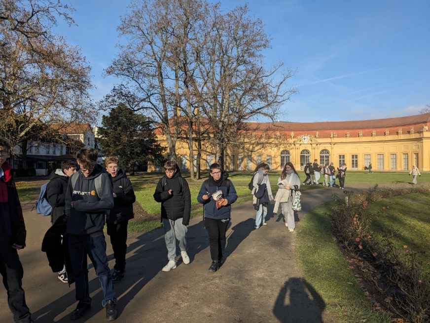 Le lendemain matin, mardi 2 décembre, les élèves ont été accueillis par la directrice de l’établissement Emmy-Noether. À la suite d’un bref discours, ils ont participé à un petit rallye avec leurs correspondants afin de mieux découvrir le fonctionnement et les lieux de l’école. Le groupe a ensuite pris le bus pour rejoindre la vieille ville d’Erlangen et visiter le musée municipal. La visite guidée, en allemand, a permis aux élèves de retracer l’histoire de cette ville fondée en 1002 et profondément marquée par l’installation des Huguenots français en 1685. Le musée présente une riche collection consacrée aux métiers huguenots, dont les tisseurs de bas, gantiers ou encore tisseurs de tapis.