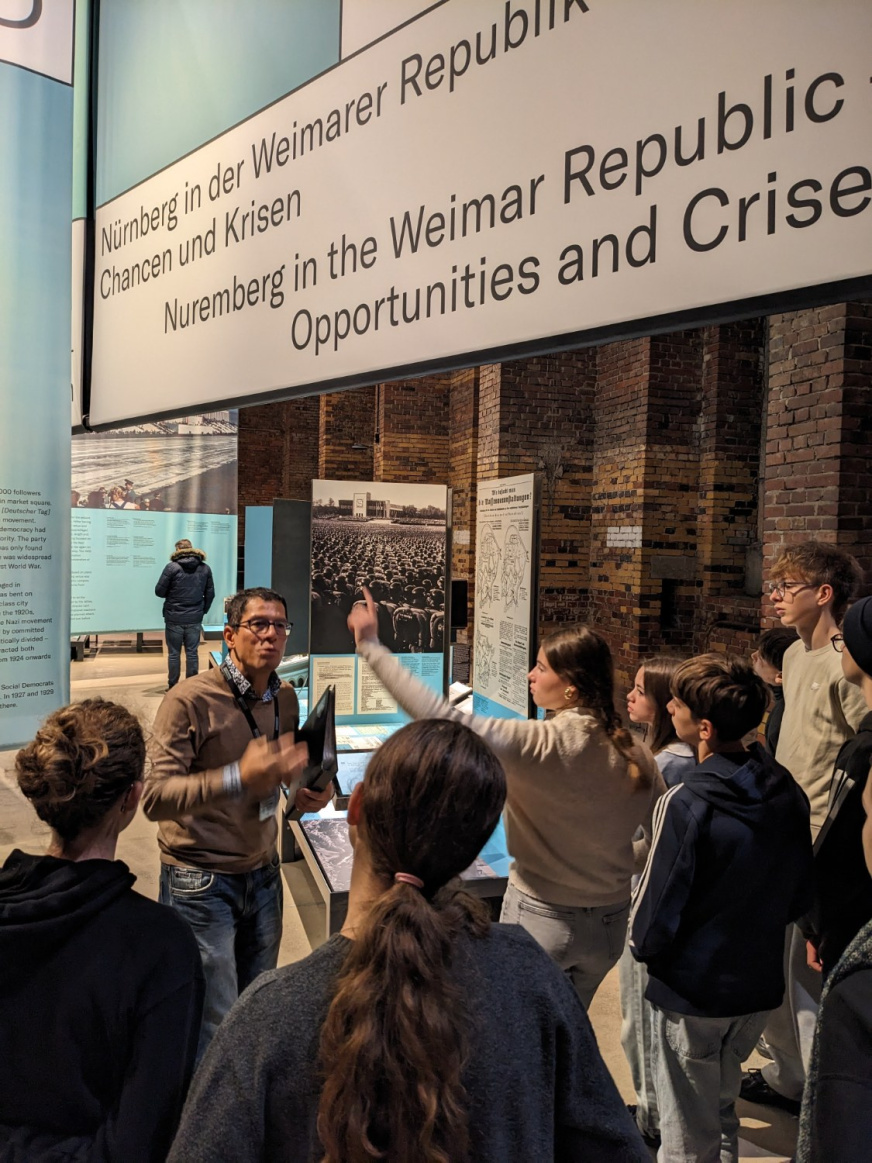 Jeudi 4 décembre, les élèves se sont rendus au Centre de documentation et d’information de Nuremberg. Lors d’une visite guidée en français, ils ont retracé l’histoire du parti nazi qui tenait ses rassemblements à Nuremberg entre 1933 et 1938. Aujourd’hui encore, des vestiges de bâtiments monumentaux témoignent de l’ampleur de ces mises en scène destinées à la propagande. Cette sortie est venue enrichir le programme d’histoire étudié en classe.